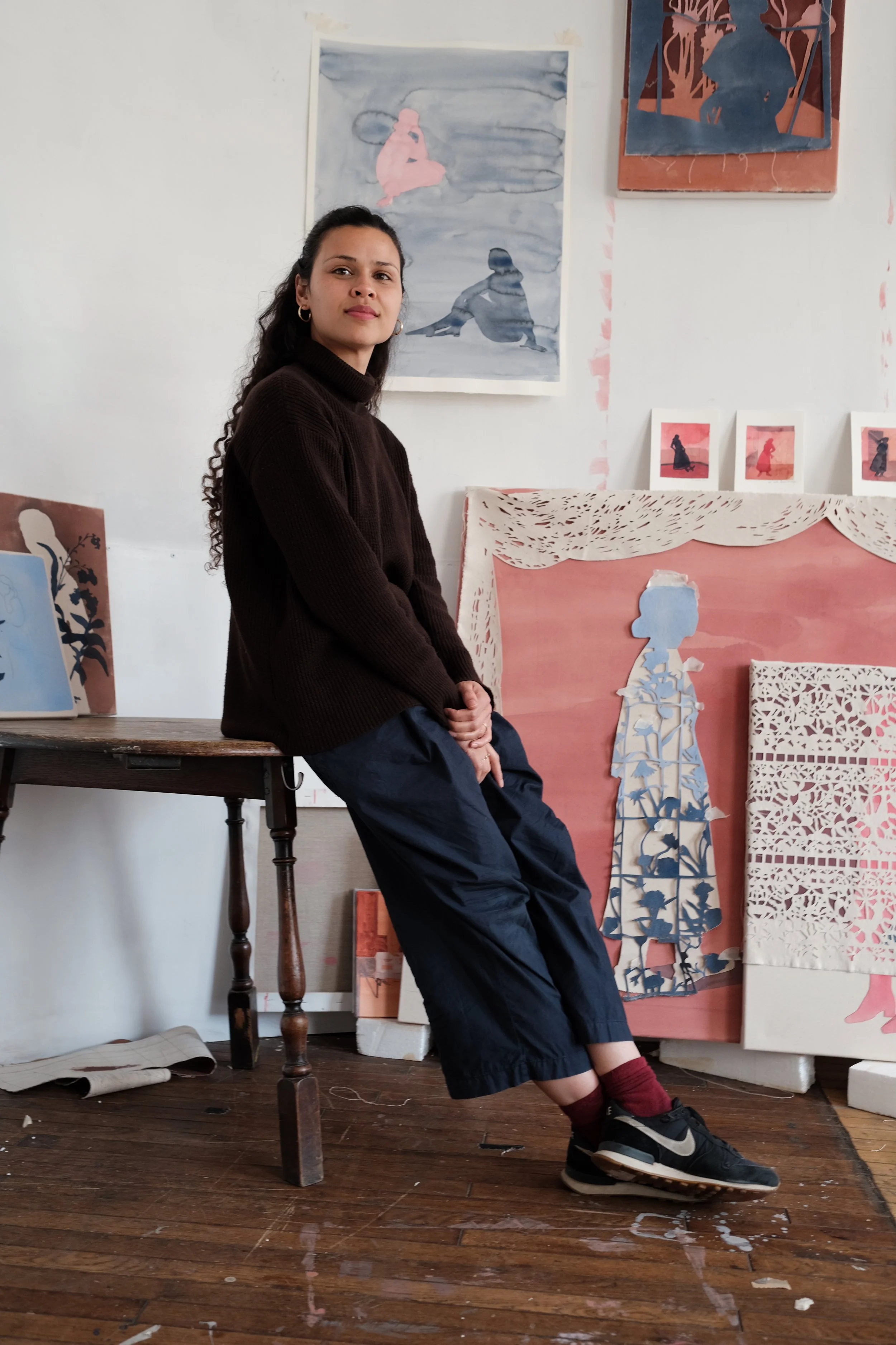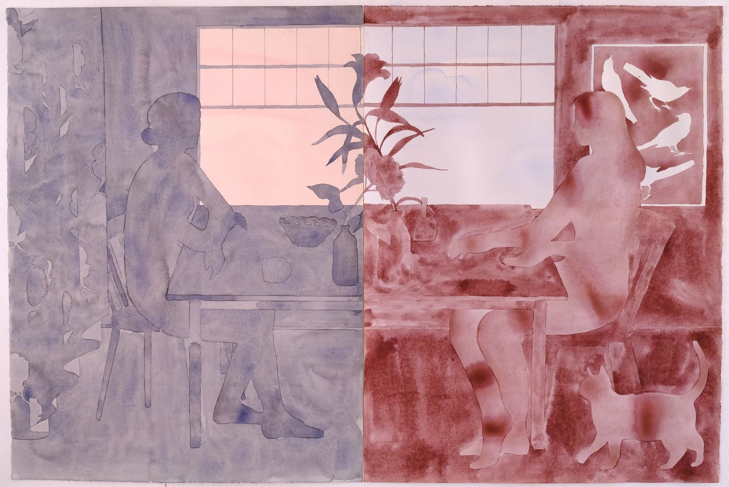 Bobbye Fermie’s practice explores experiences of belonging, personal boundaries, and social anxiety through delicately constructed layers of painting and collage. Working with washy acrylics on canvas and watercolour on paper, she often depicts a solitary female figure set within imagined interiors—spaces that hover between the private and the public. These interiors function as protective enclosures: quiet sanctuaries where the figure can retreat, reflect, and endure.