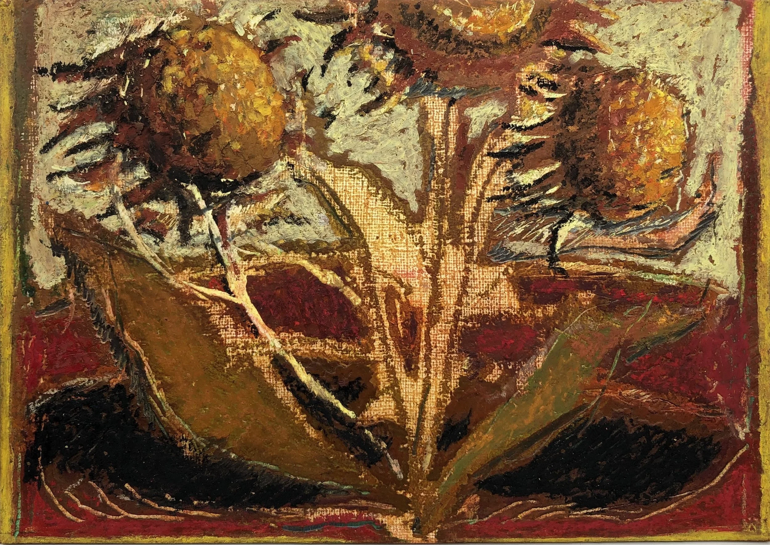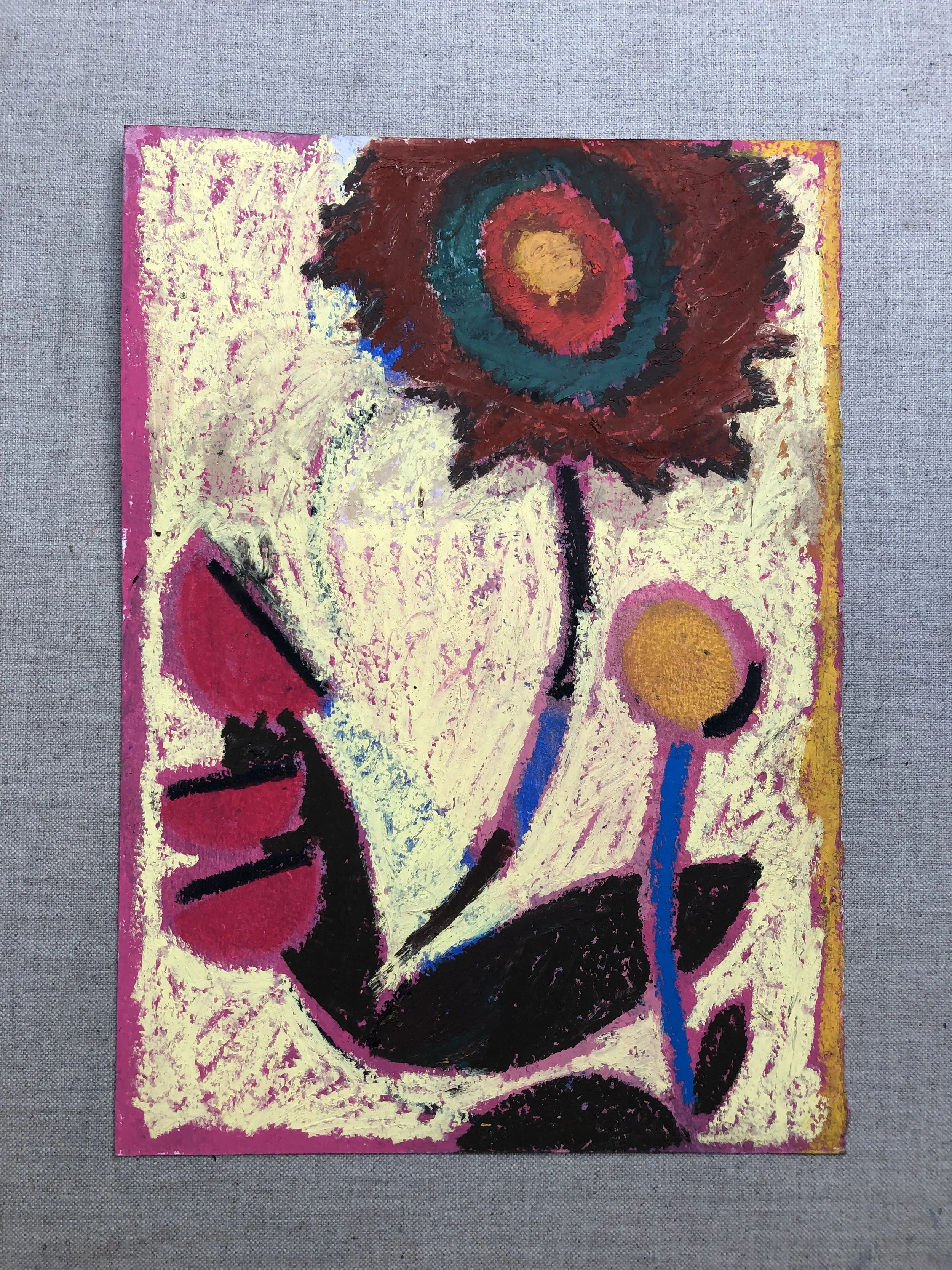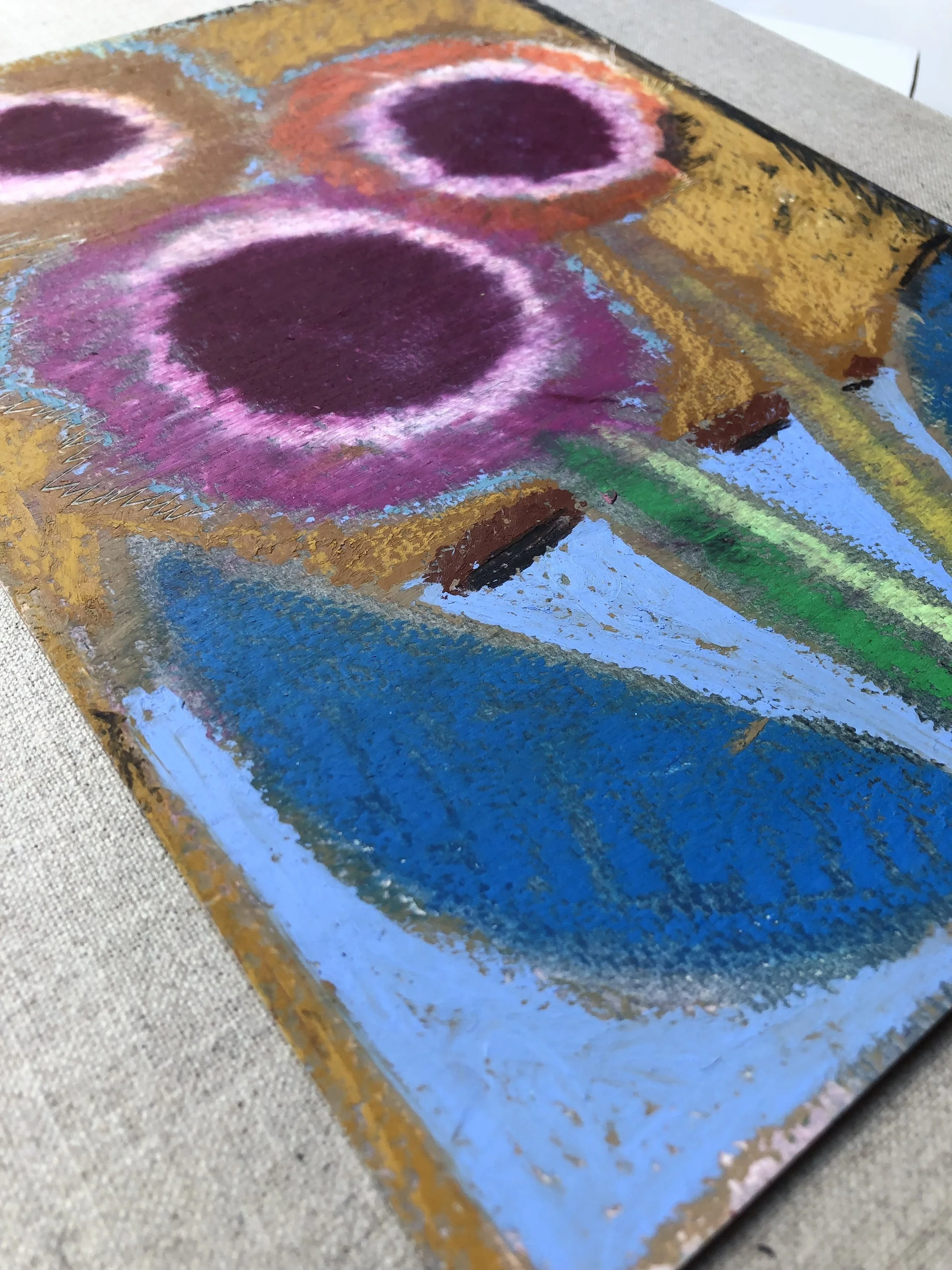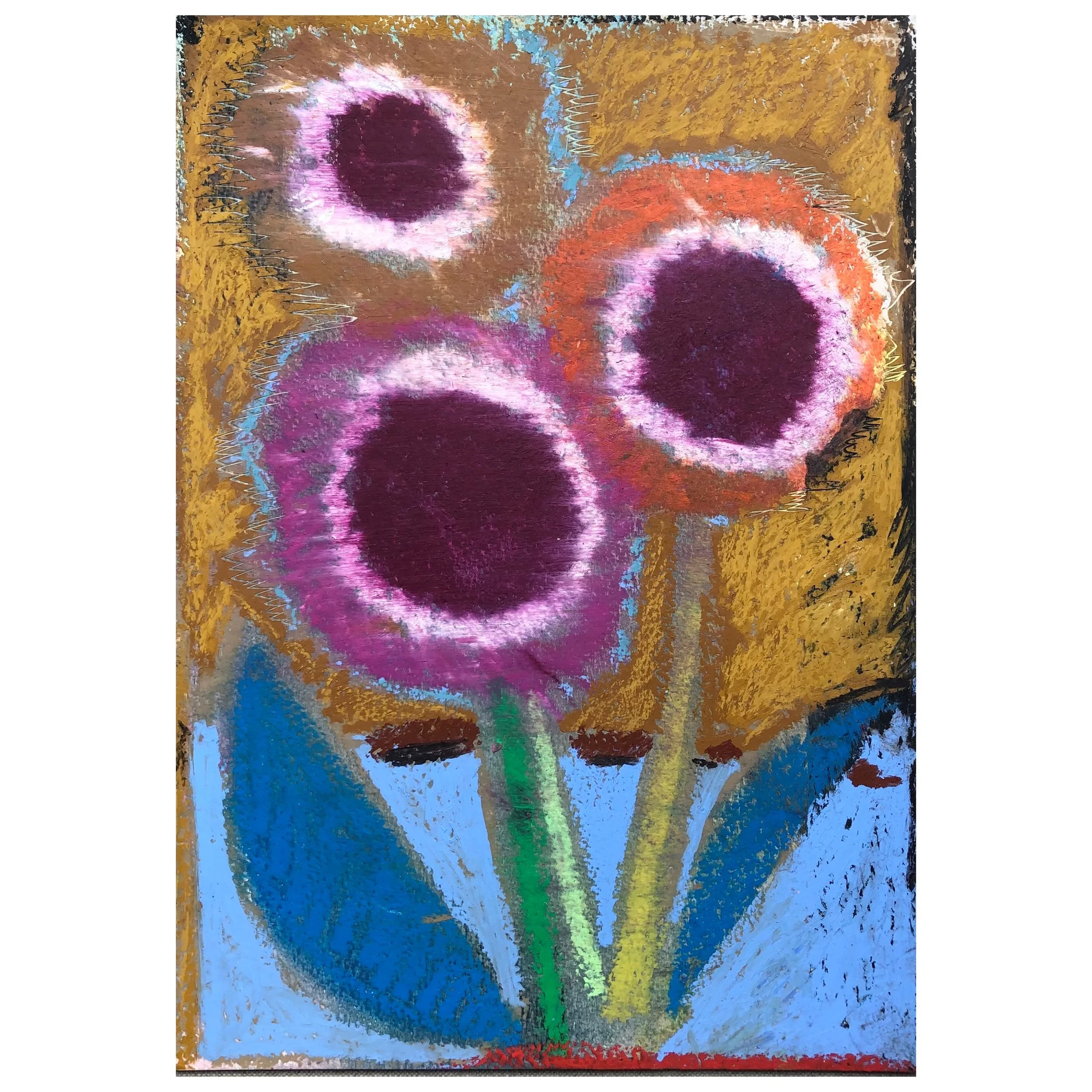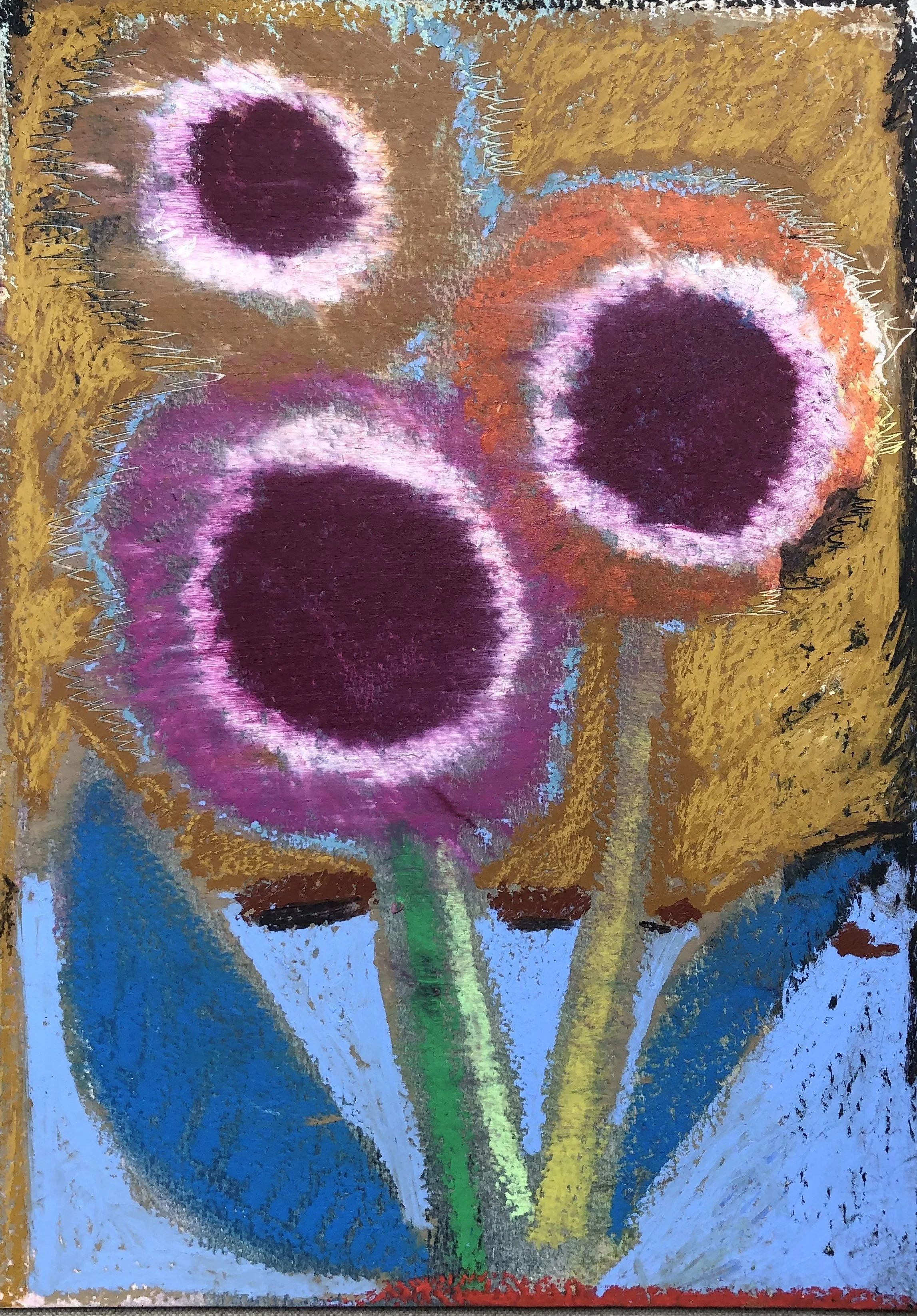 A series of work in response to the landscape around me, from the joy of spring and early first petal, to the scorching heat of summer. Sensing a shift. The act of painting for me has become a strange play between looking closely and memory. Adding Layers to then scrape them away, the paintings and drawings are found. Allowing reoccurring motifs to emerge, anchored into the work. From sun bleached flowers to vivid sunsets and dancing daisies. A subconscious response rather than a clear depiction.